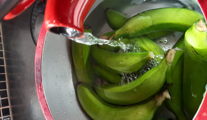 Lave bem as bananas com água filtrada, esponja e sabão neutro, cuidando para retirar toda a sujeira presente;