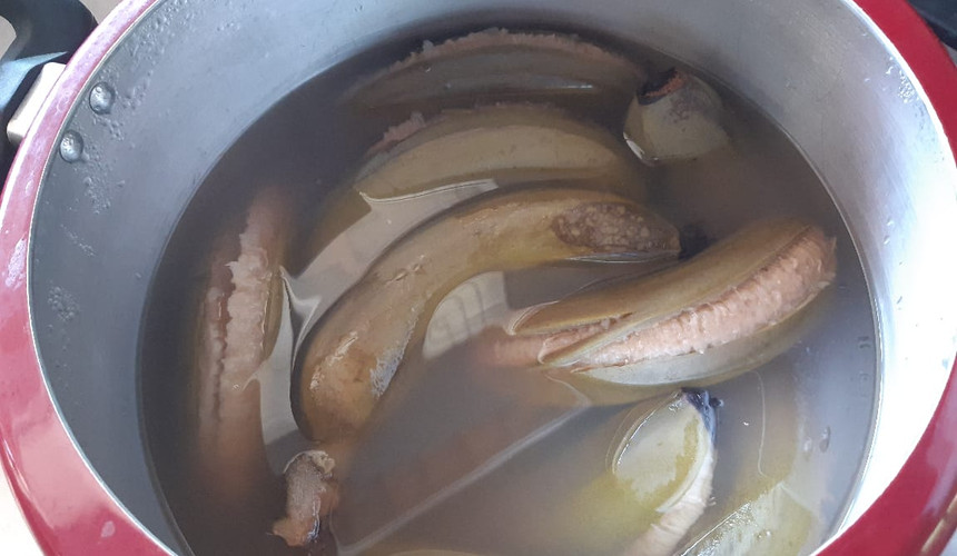 Logo que ferver a água, coloque as bananas limpas, feche a panela e deixe em fogo alto até começar a chiar, abaixando o fogo em seguida. Deixe na pressão por 10 minutos;